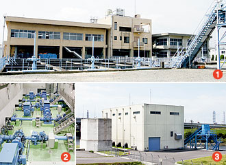 ①江場ポンプ場 ②播磨浄水場送水ポンプ棟内部 ③城南排水機場
